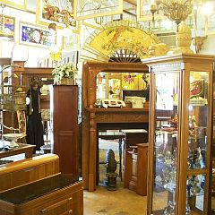 | In addition to the studio, we had a spacious showroom with a large collection of antique windows and antique doors encompassing Victorian, Art Nouveau, and Art Deco design. All had been painstakingly restored to their original condition. We offered these refinished architectural antiques and furniture through our sister company, Sunset Antiques. Large pieces such as back bars and fireplace mantels were our specialty, and we stocked one of the largest collections of restored fireplace mantels in the Midwest. | ||